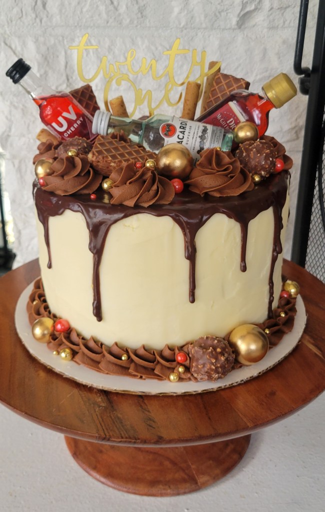 Happy April! Over the weekend I made a birthday cake. It was one of those cakes that went so smoothly it was scary, but I will admit I took the time to plan every step out perfectly. After crumb coating the cake, I looked at it for a while and felt that giddy blank canvas feeling, realizing that this is truly my favorite part of decorating cakes. The blank canvas before I let my mind go wild and make it beautiful. The anticipation of getting to make something special for someone’s special day. It’s a really good feeling that only brings that feeling of momentum to find ways to do it more. I frosted it with a smooth buttercream and flooded the top with a chocolate ganache, making sure to have some drips. I love a good chocolate drip! I then mixed up a chocolate frosting, and the piping fest began. Chocolate candy, red and gold sprinkles and mini liquor bottles to finish it perfectly for a 21st birthday! It was a fun cake, well they are all fun, but the added feeling of a blank canvas ahead definitely heightened the joy and created a momentum to go fast forward into even more!